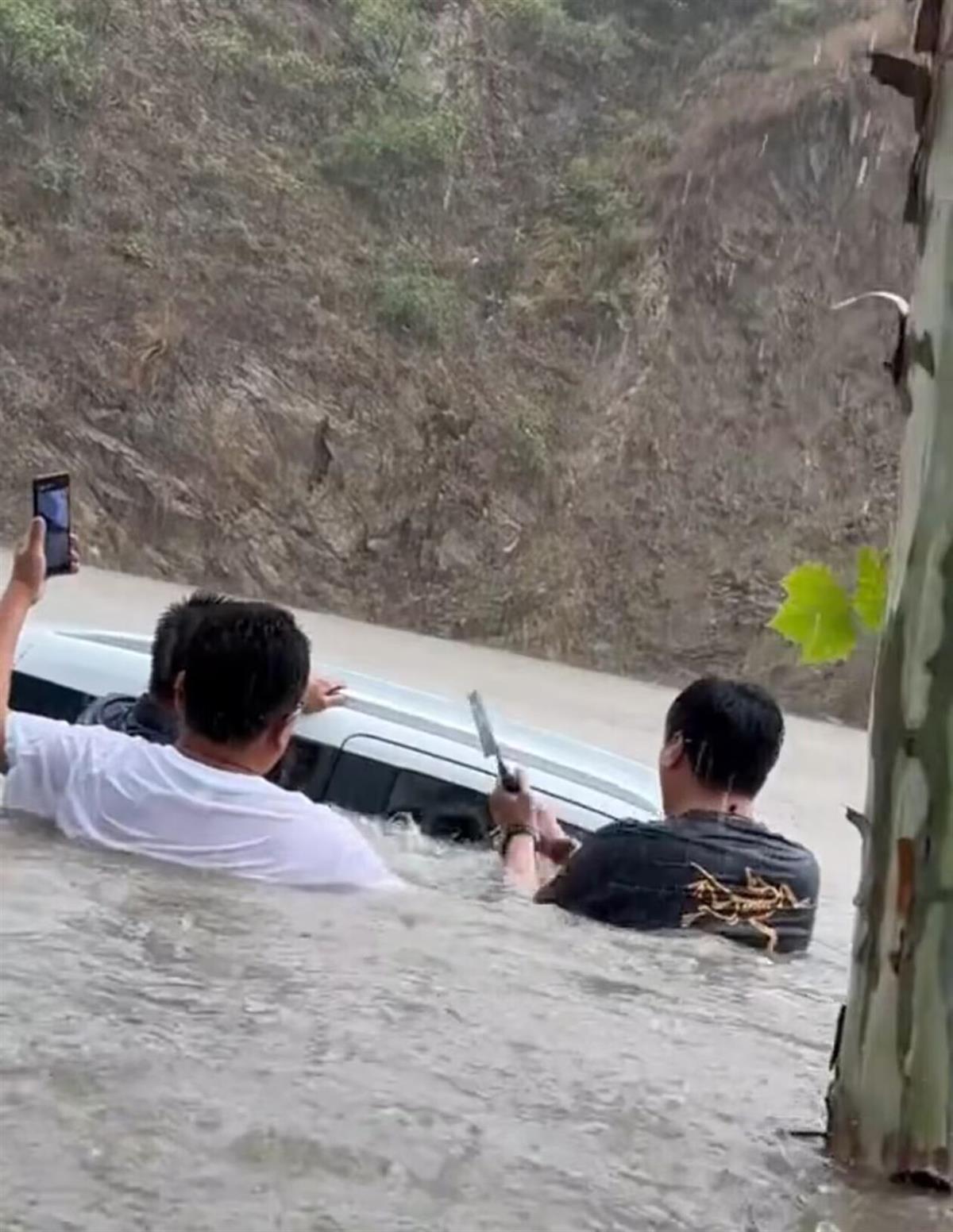 “我們下車在水里蹚了三五十米來到顧客的車輛旁,馬上破窗。”王先生稱,破窗時,水已經快淹到車輛頂部,車內僅剩小部分空間。迅速破窗之后,王先生伸手進去拽了兩三下,就撈到車主的手了,然后一把把她給拽了出來。將人救出來后,王先生往回看了一眼,發現洪水已經淹沒了車頂。從出發到救援完成,不到20分鐘。