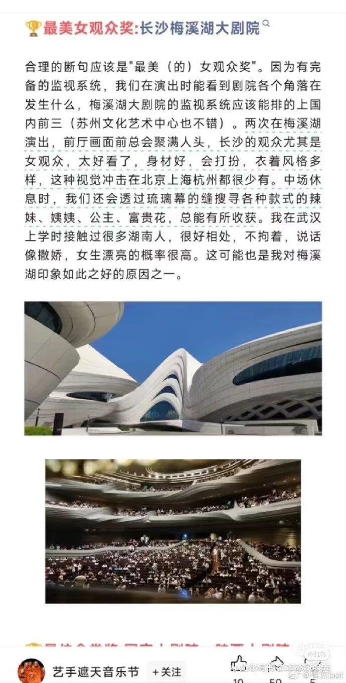 極目新聞記者發現,6月18日,有網友在小紅書等平臺爆料稱,江蘇大劇院工作人員曹陽發布在公眾號“藝手遮天音樂節”上的文章里,以“最美女觀眾獎”點評《紅樓夢》巡演過的長沙梅溪湖大劇院,曹陽在文中提到:“因為有完備的監視系統,我們在演出時能看到劇院各個角落在發生什么……兩次在梅溪湖演出,前廳畫面前總會聚滿人頭,長沙的觀眾尤其是女觀眾,太好看了,身材好,會打扮,衣著風格多樣?!?/p>