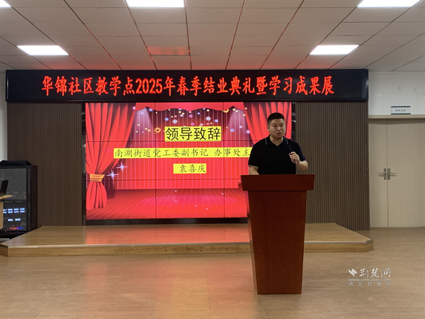 南湖街道辦事處主任袁喜慶在致辭中肯定了社區教育工作成效,指出社區教育對構建學習型社會、提升居民幸福指數的重要作用,勉勵學員積極參與社區建設,實現“老有所學、老有所樂、老有所為”。
