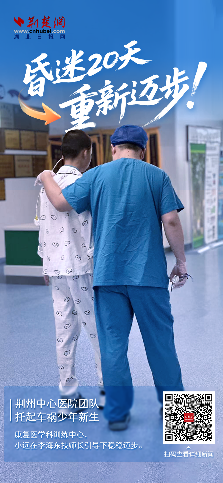 6月12日,在荊州市中心醫(yī)院康復(fù)醫(yī)學(xué)科的訓(xùn)練中心內(nèi),14歲的小遠(yuǎn)(化名)正穩(wěn)穩(wěn)站立,在技師長李海東的引導(dǎo)下一步步向前邁出。就在一個多月前,他還因嚴(yán)重車禍陷入深度昏迷,命懸一線。從無法自主呼吸到獨(dú)立行走,這場生命的逆襲,是重癥醫(yī)學(xué)科、康復(fù)醫(yī)學(xué)科、高壓氧科多學(xué)科無縫協(xié)作的現(xiàn)代醫(yī)學(xué)奇跡。
