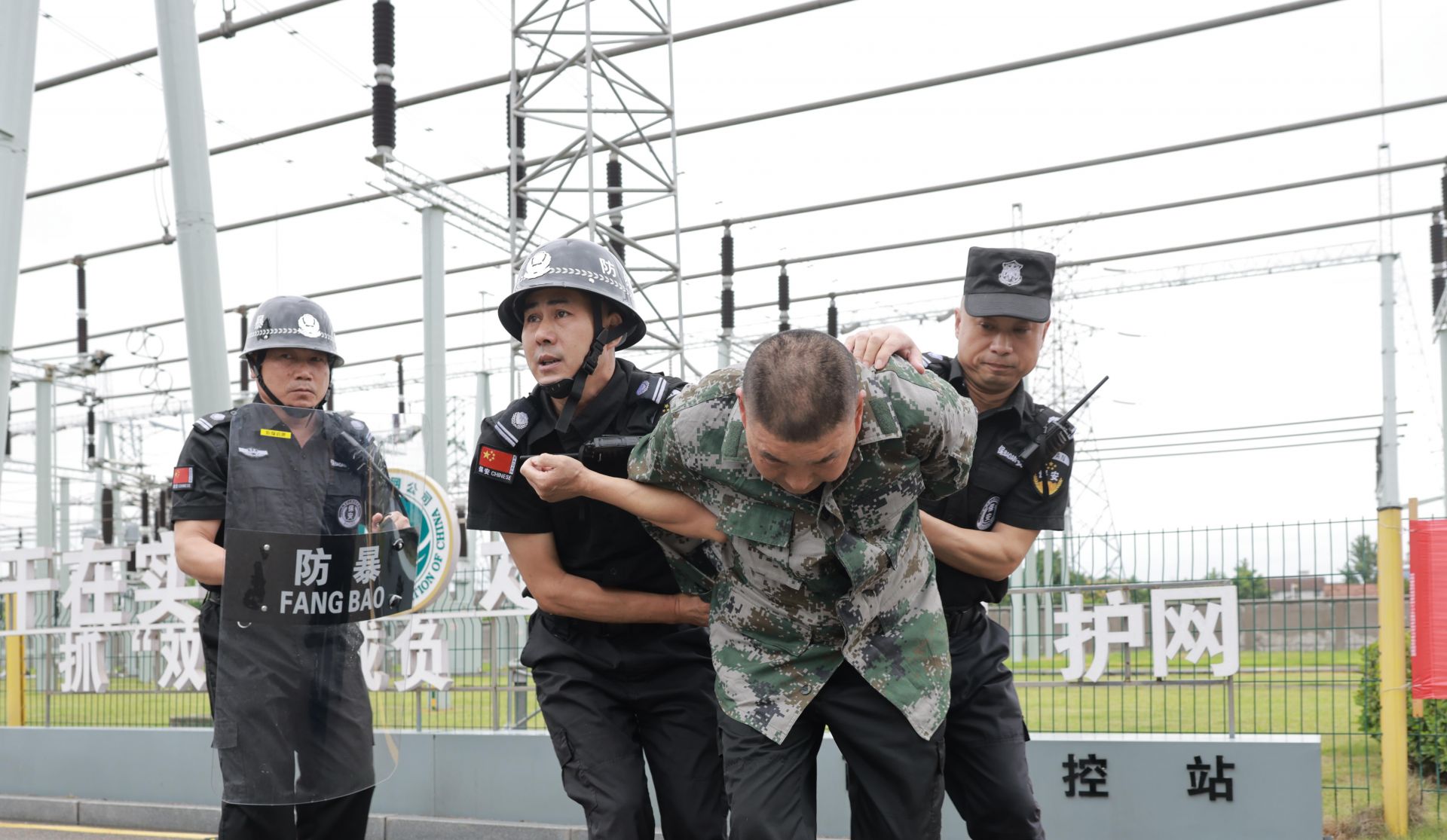 演練模擬真實警情:一名持刀男子強行闖入變電站區域意圖滋事。險情即命令!變電站門衛應急機制瞬間激活,三名訓練有素的安保人員手持專業防暴裝備迅速合圍。他們一面厲聲警示威懾,一面默契配合,以最小風險動作高效完成對不法分子的壓制與控制。從發現險情到成功制服并將嫌疑人押離現場移交公安機關,全程僅耗時2分21秒。