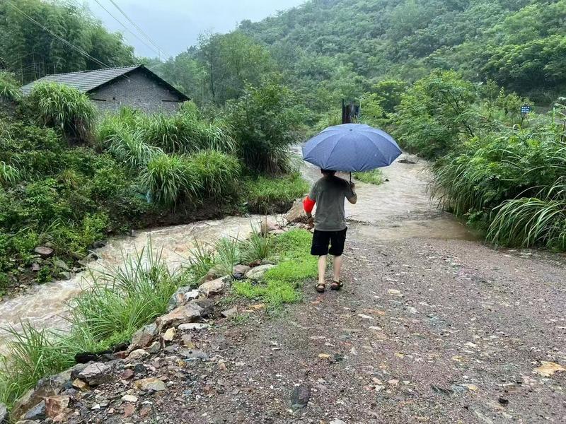 6月20日,廟河村村干部胡勁松在雨中巡查地災點(廟河村村委會供圖)