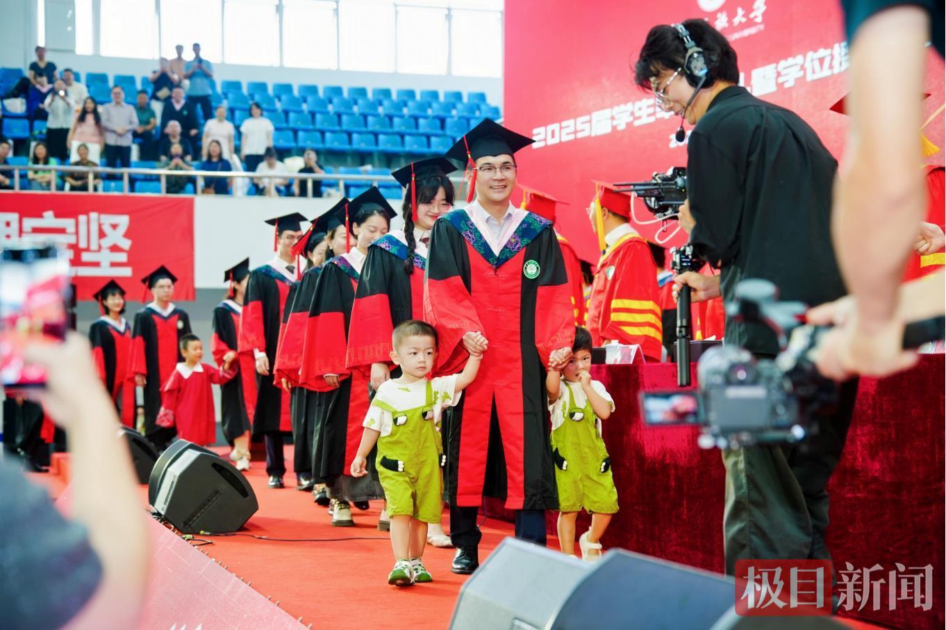該校共同體學院馬克思主義民族理論與政策專業博士畢業生韋貴方步入會場時引發關注——他牽著兩歲多的龍鳳胎寶貝一同上臺,從導師團手中接過學位證書并完成撥穗儀式,導師們面帶溫和笑意,目光中滿是欣慰與期許。臺下的師生們更是瞬間被萌化,不少人舉起手機記錄下這有趣的一幕,還有人對著龍鳳胎寶寶眨眼睛、做鬼臉,現場氣氛既莊重又洋溢著滿滿的溫情與歡樂。