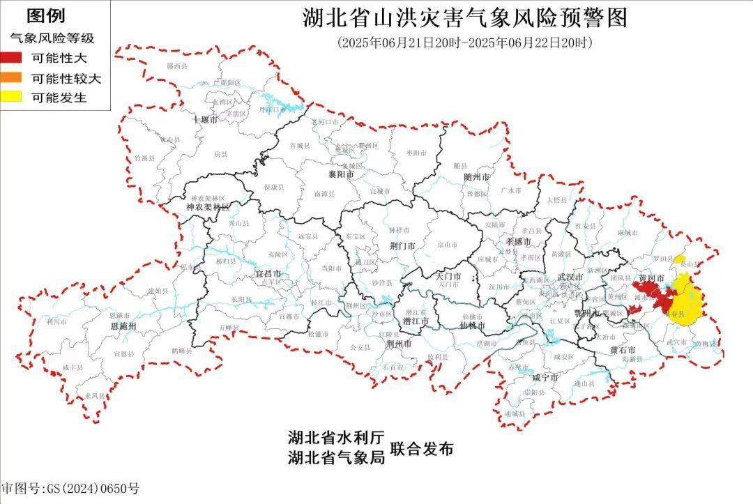 紅色預警區域(山洪災害可能性大):黃岡市(蘄春縣、白蓮河示范區、浠水縣)。
