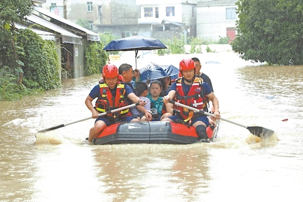 6月18日以來,湖北遭遇今年入梅后首輪強降雨,截至21日8時,全省面雨量達104毫米,接近歷年平均梅雨總量(250毫米)一半。全省各地快速響應、精準布防,壓實“防、抗、救”三道關口,構建起科學應對、聯動協同的防災減災救災網,把風險化解在預防中,把主動權掌握在關口前移中。圖為6月19日,來鳳縣消防救援人員轉移被困群眾。楚天都市報極目新聞通訊員鄂消宣攝