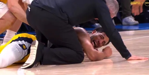 首節(jié)比賽,他在無(wú)對(duì)抗情況下重重摔倒,表情痛苦,在地板上連連捶擊。隨后,他被隊(duì)友攙扶離場(chǎng),并未再回歸。據(jù)其父親向美媒透露,傷情疑似為跟腱損傷,尚待進(jìn)一步確認(rèn)。