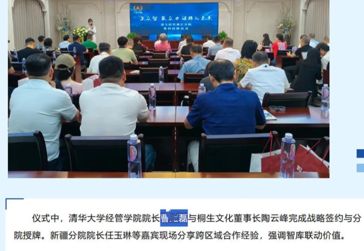 該文章提到,6月22日上午,清華大學經濟管理學院浙江分院簽約授牌儀式在海寧上川商務有限公司舉行?;顒泳劢埂凹娭蔷郾娏χ\非凡未來”主題,來自清華大學、企業界的代表齊聚一堂,共同見證這一推動區域經濟發展的重要時刻。儀式中,清華大學經管學院院長曹某磊與桐生文化董事長陶某某完成戰略簽約與分院授牌。