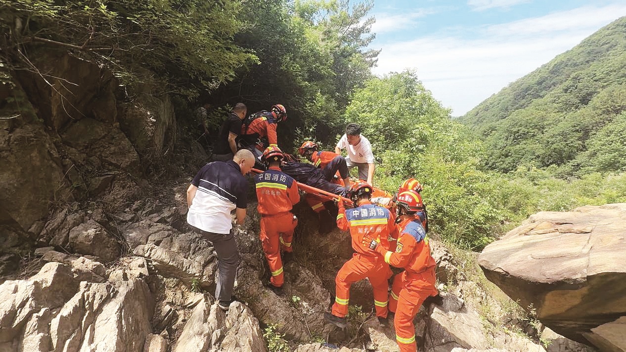 原來,王某和朋友相約到楊樹田附近的山上釣魚,本想找個清凈地兒享受悠閑時光,誰知一腳踩滑,腰部重重著地,動彈不得。當(dāng)時烈日當(dāng)空,氣溫在30攝氏度以上,同行的朋友急得直冒汗,試了各種辦法都沒辦法將大爺安全送下山,只好撥通119求助。