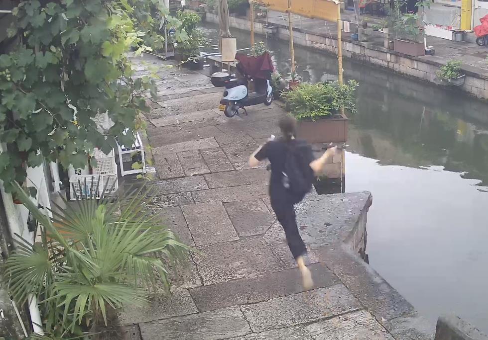 監控視頻顯示,23日清晨6時18分許,一位在河邊洗衣物的阿姨不慎落水,情況危急。此時,一名外國姑娘一邊狂奔一邊丟掉背上的背包,英勇跳水救人。