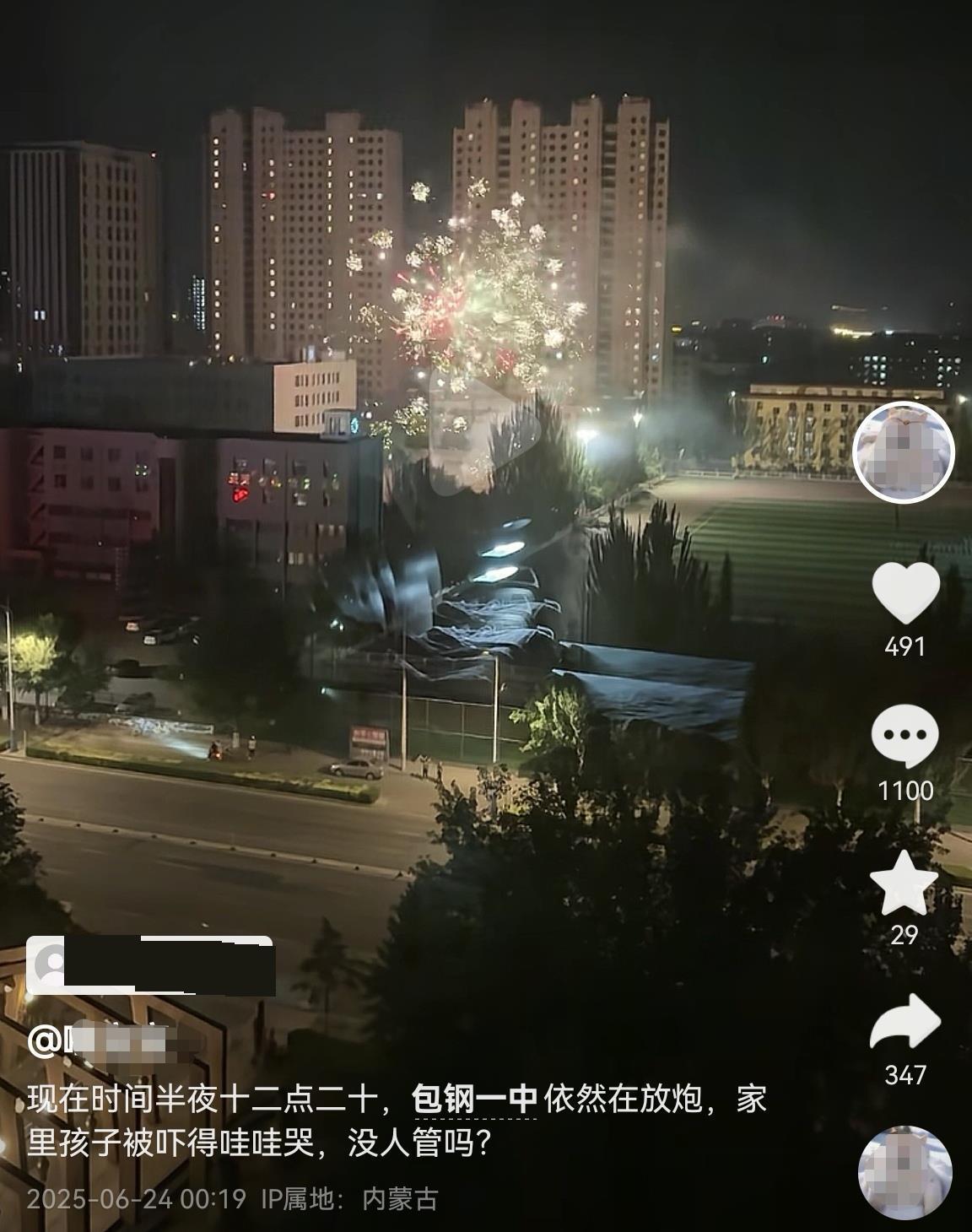 據IP地址為內蒙古的網友24日凌晨0時19分發視頻吐槽稱,都半夜了,包鋼一中(已改名為包頭市第九十五中學)依然在放炮,家里孩子被嚇得哇哇大哭,沒人管嗎?極目新聞記者私信該網友,暫未獲回復。