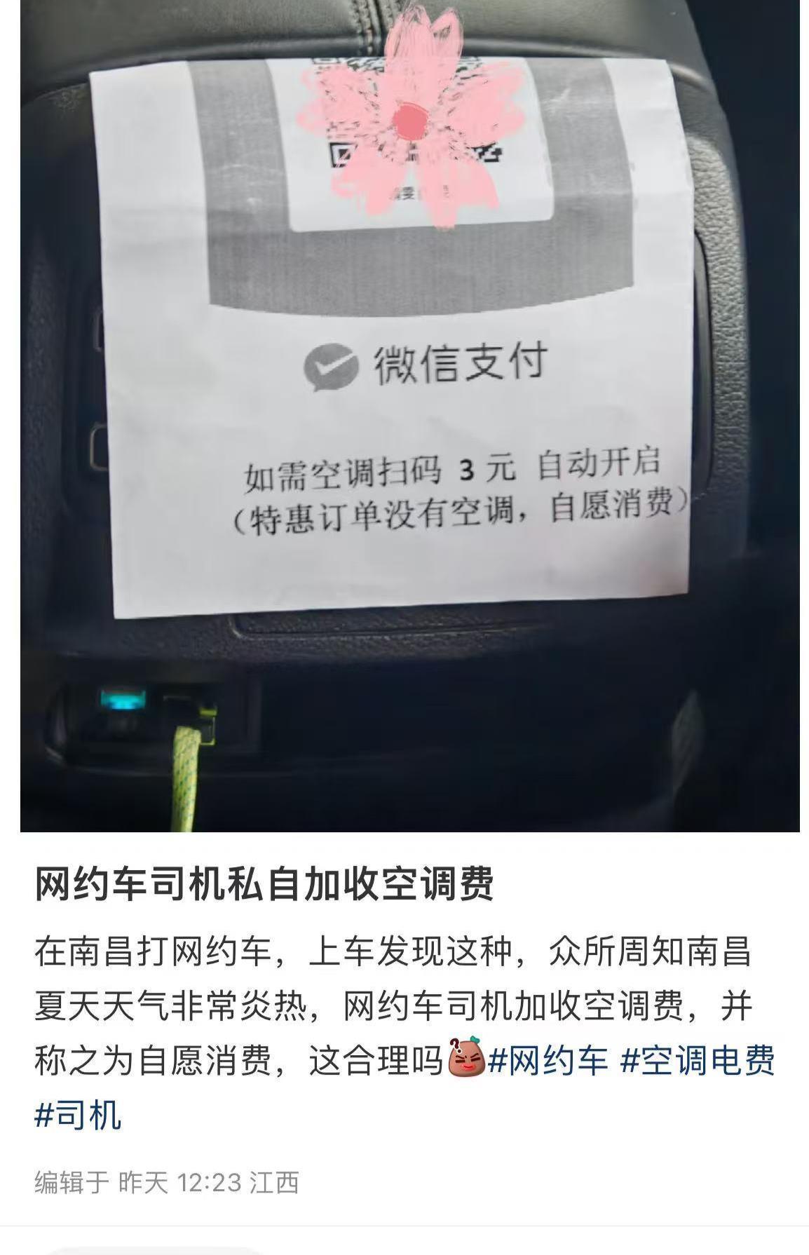 近日,一網友發帖吐槽在南昌乘坐特惠網約車時,司機不開空調,開空調要額外收費,并配上一張司機貼的告示,“如需空調掃碼3元,自動開啟”,“特惠訂單沒有空調,自愿消費。”帖子引發網友熱議。