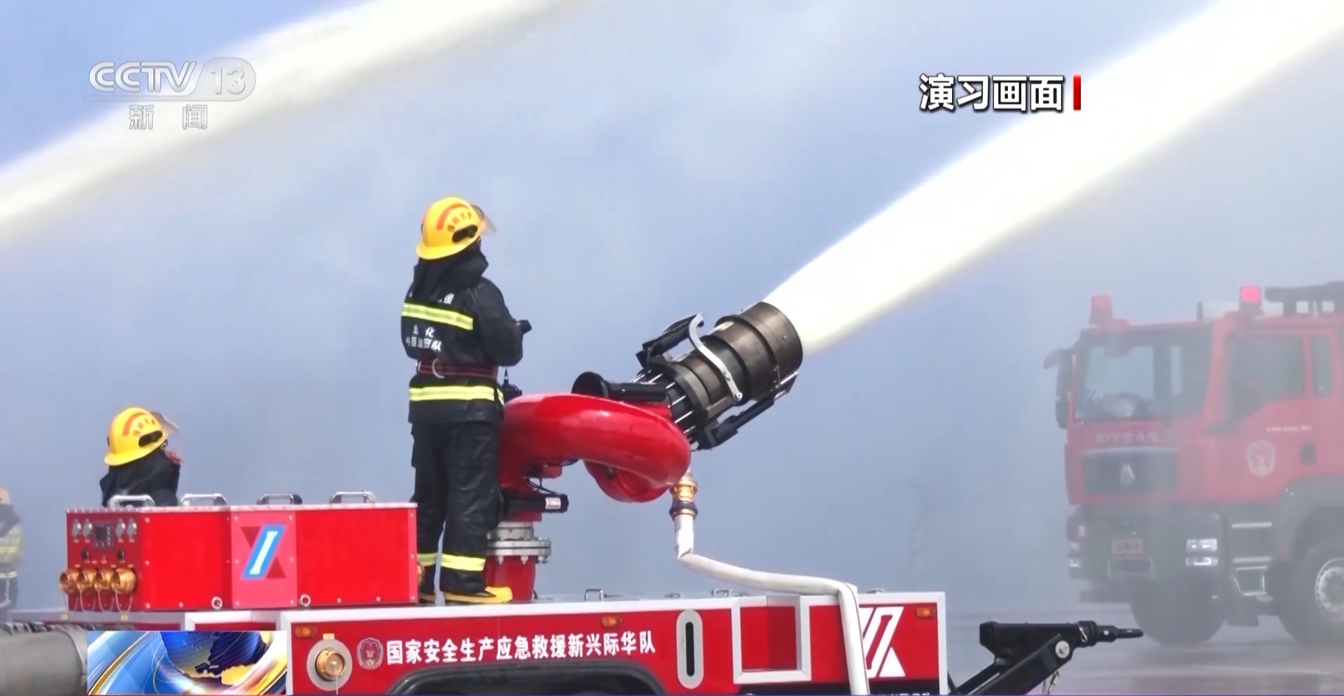 演習專家組成員、新興際華智能裝備技術研究院 關鴻志:拖車炮里是在水中混合特定比例的泡沫液,把水變成細微的顆粒,提高與油料的接觸面積,降溫更快,同時在燃燒的表面形成泡沫覆蓋層,隔絕火焰與空氣的接觸,加速滅火進程。