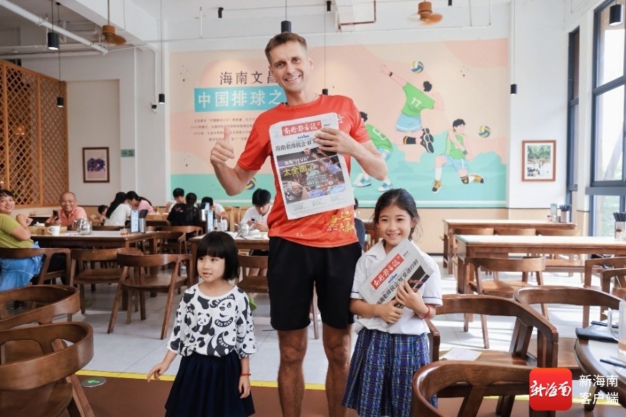 海南旅游國際推薦官購買報紙,與《南國都市報》報童合影留念。主辦方供圖