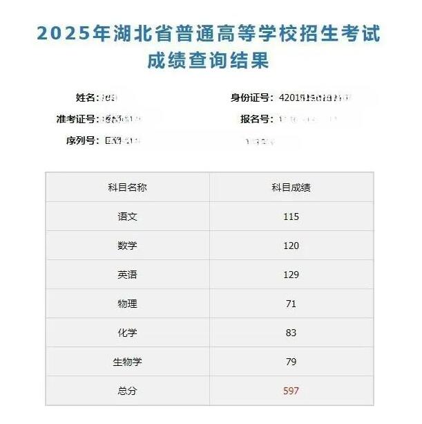 據(jù)極目新聞報道,“查到啦!查到啦!”6月25日凌晨5點多,武漢市一名考生已查到高考分數(shù):語文115,數(shù)學120,英語129,物理71,化學83,生物79,總分597分。