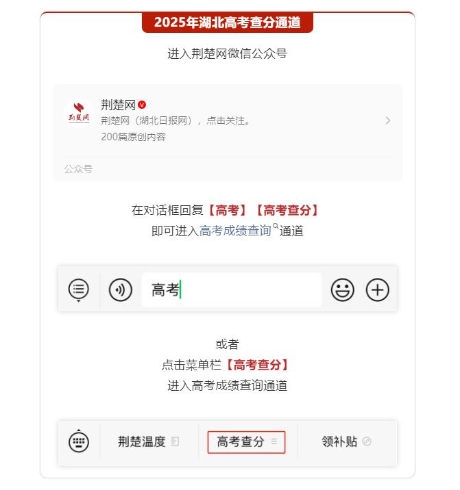 2.成績查詢方式:考生可通過湖北省教育考試院網站(http://www.hbea.edu.cn)、湖北省教育廳網站(http://jyt.hubei.gov.cn)和微信公眾號、湖北政務服務網(http://zwfw.hubei.gov.cn)、鄂匯辦APP、湖北發布微信公眾號、極目新聞微信公眾號、湖北日報客戶端和微信公眾號、長江云新聞客戶端和微信公眾號、湖北招生考試網(http://www.hbksw.com)、湖北教育考試網(http://www.hbccks.cn)查詢本人成績。