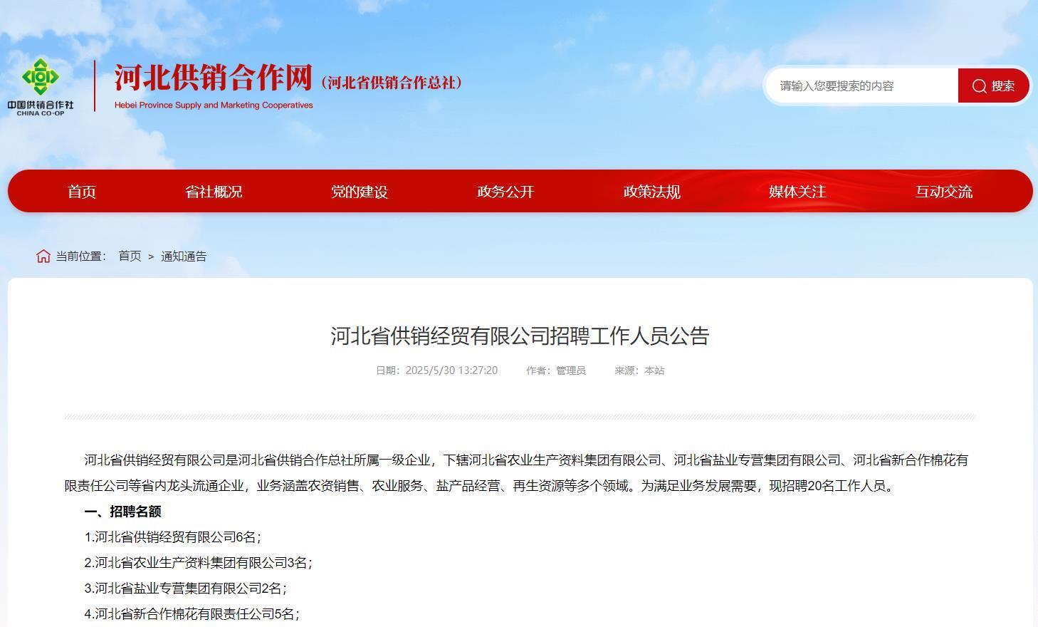 據了解,河北省供銷經貿有限公司是河北省供銷合作總社所屬一級企業。記者先后聯系上該總社辦公室和人事處,工作人員回復,已匯報此事,相關部門也很重視,因為這是下屬企業公司組織的招聘,所以需要時間核實,屆時核實完了應該會有人再聯系記者。