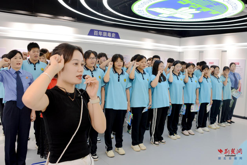 參觀結束后,基地內回蕩起青春激昂的誓言。全體學生在檢察官的帶領示范下,表情莊嚴,高舉右拳,“珍愛生命,遠離毒品”的誓言響徹教育基地的每個角落。
