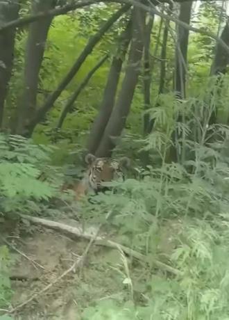 視頻畫面顯示,拍攝者當時駕車行駛在林間,突然發現路邊有一只野生東北虎躲在草叢里,于是搖下車窗拍了一段視頻,并稱:“這山有這玩意兒,誰敢上,你看這大腦袋。”這只東北虎發現有人靠近后,隨即趴在草叢里與拍攝者對望,兩只耳朵還在不停翻動,片刻后便離開了。