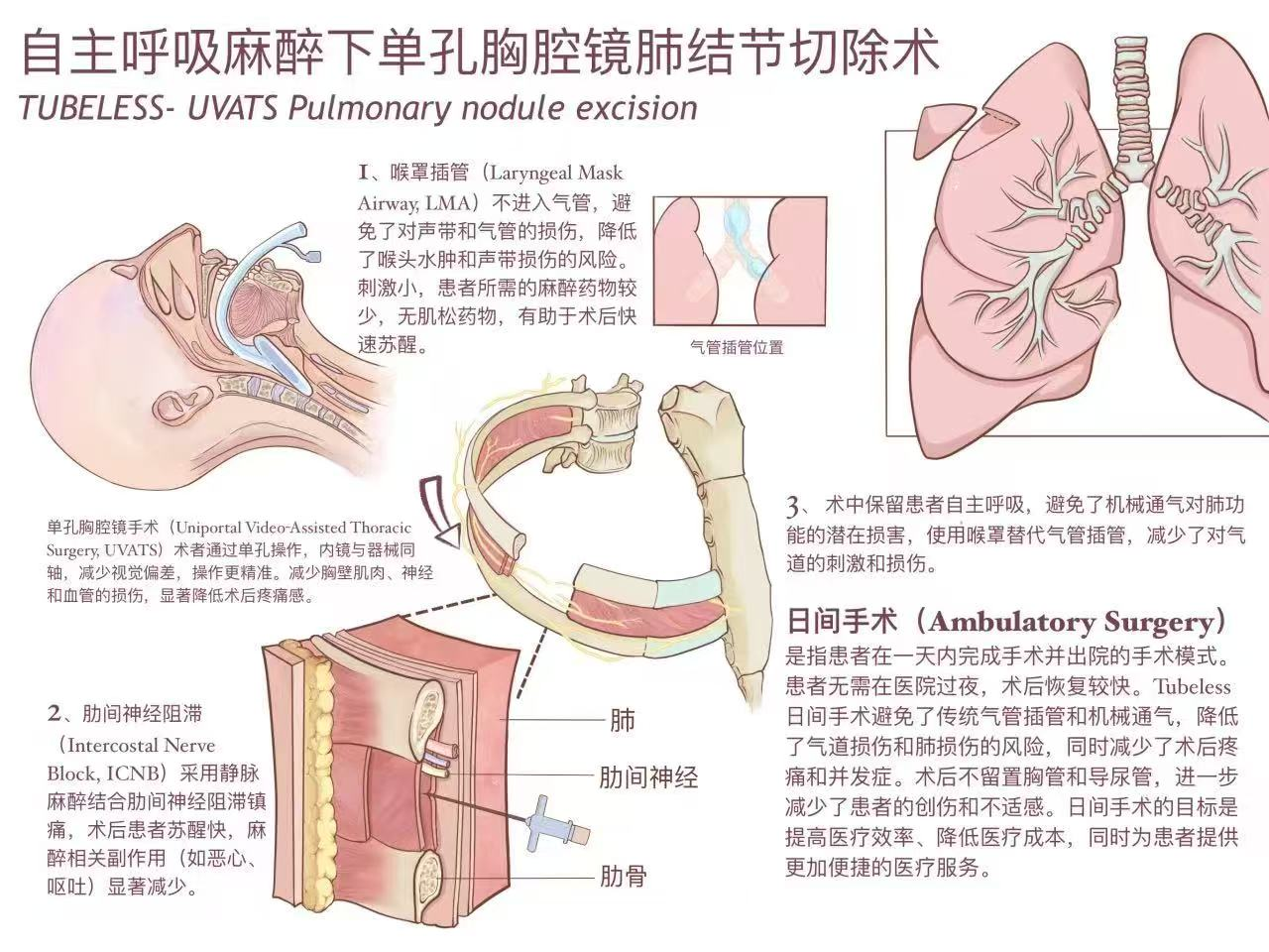 與傳統手術相比,這場手術在管路處理上實現了重大突破!術前,團隊取消了常規的尿管和深靜脈置管,最大程度降低侵入性操作;術中,患者無氣管插管,始終保留自主呼吸,避免了氣管插管帶來的損傷與疼痛;術后,更是無需留置胸管及尿管。手術完成當天,患者便能進食并下床活動,且幾乎感受不到明顯疼痛。術后病理結果顯示,該結節為微浸潤肺腺癌,這意味著手術不僅成功切除病灶,更以極小的創傷幫助患者開啟康復之路。