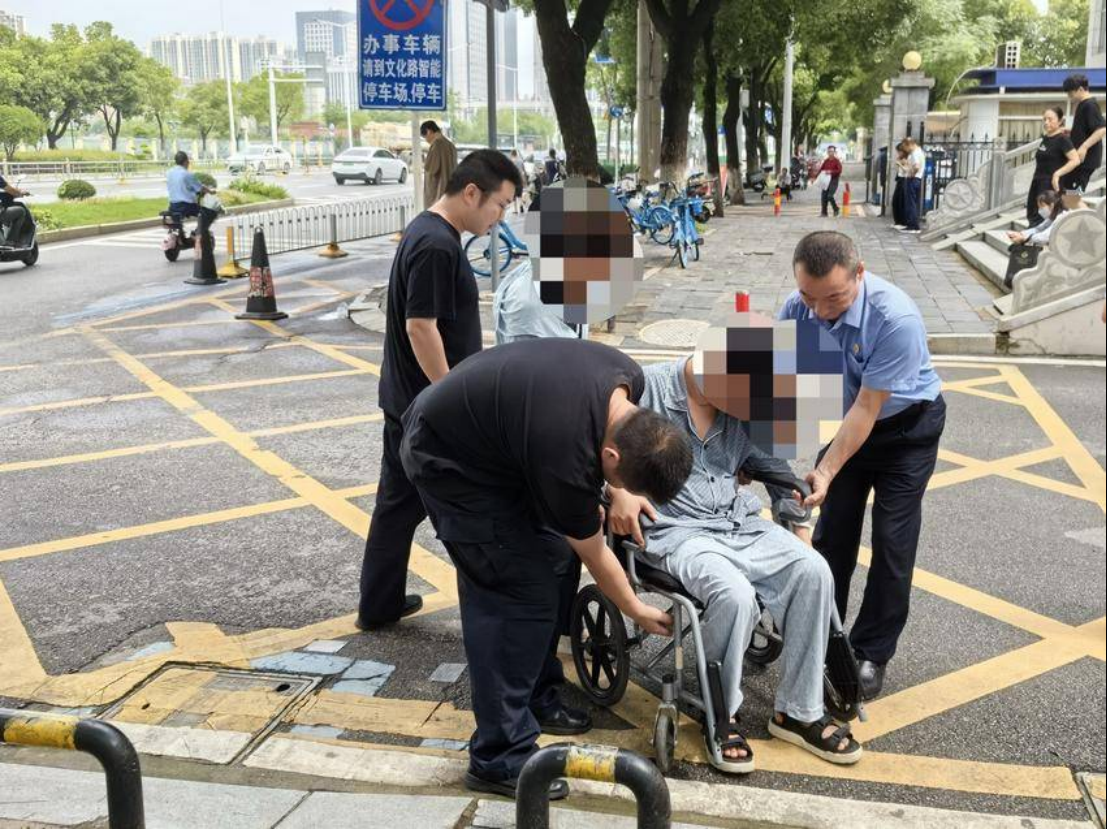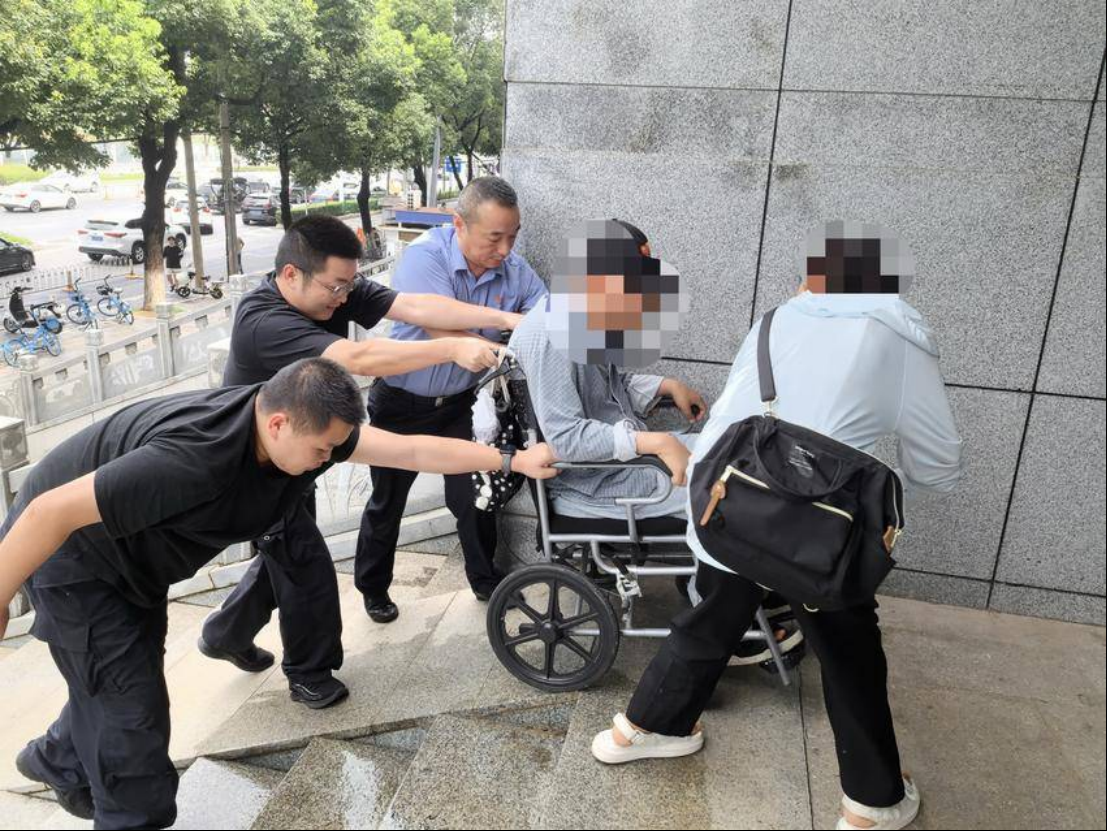 接到求助后,紙坊派出所戶政窗口職工唐斌立即與呂爹爹及其家人溝通,提前約定好辦理時間,并貼心地考慮到戶政大廳門前有一段樓梯,輪椅通行困難。于是,唐斌提前安排了兩名身強力壯的輔警,一同在樓梯下等候。
