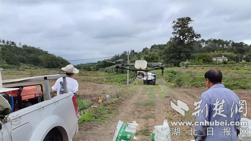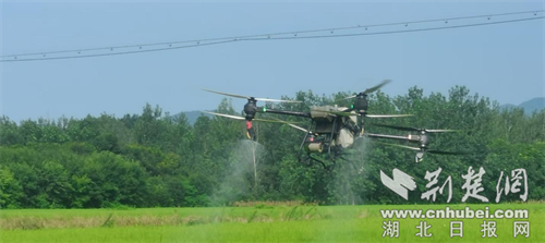 荊楚網(湖北日報網)訊(通訊員 廖明勇 蘆馨怡)6月24日,在京山市三陽鎮團林村石門口社區七組,一架植保無人機正在開展施肥、病蟲害防治等作業,為當地農作物豐產保駕護航。