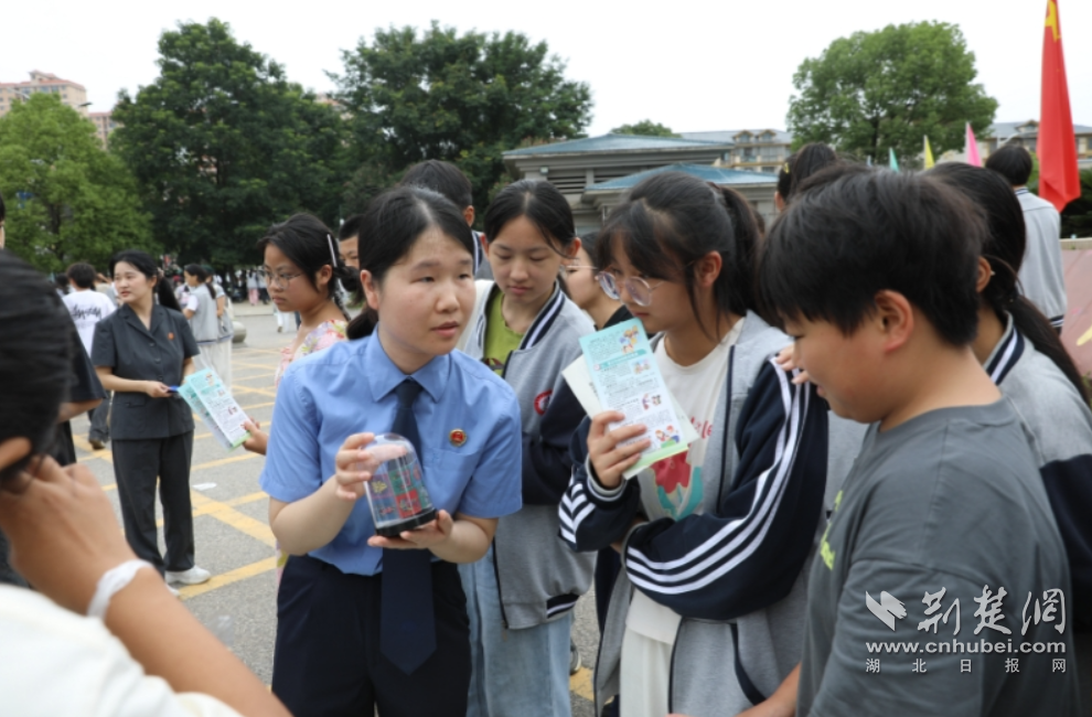 荊楚網(湖北日報網)訊(通訊員蔡格)6月26日,國際禁毒日,嘉魚縣檢察院未成年人檢察部門、刑事檢察部門聯合縣法院少年刑事審判庭,來到縣第一初級中學門口,為同學們精心準備了一場擺在校門口的禁毒宣傳活動,為孩子們的青春之路筑牢禁毒防線。