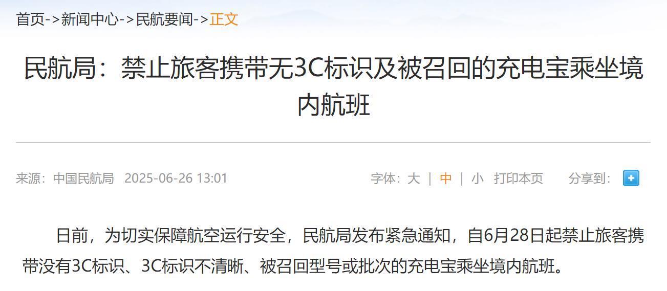 記者注意到,6月26日13時,中國民用航空局官網(wǎng)發(fā)布消息:日前為切實保障航空運行安全,民航局發(fā)布緊急通知,自6月28日起禁止旅客攜帶沒有3C標識、3C標識不清晰、被召回型號或批次的充電寶乘坐境內(nèi)航班。