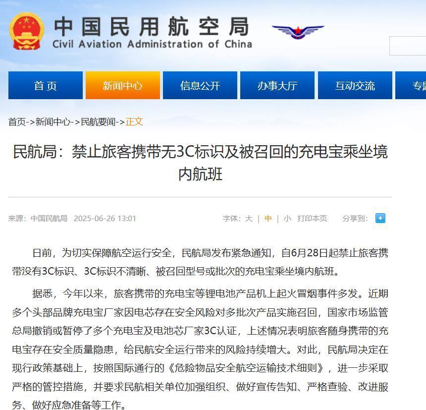 6月26日,中國民航局發布緊急通知,自6月28日起,禁止旅客攜帶沒有3C標識、3C標識不清晰、被召回型號或批次的充電寶乘坐境內航班。
