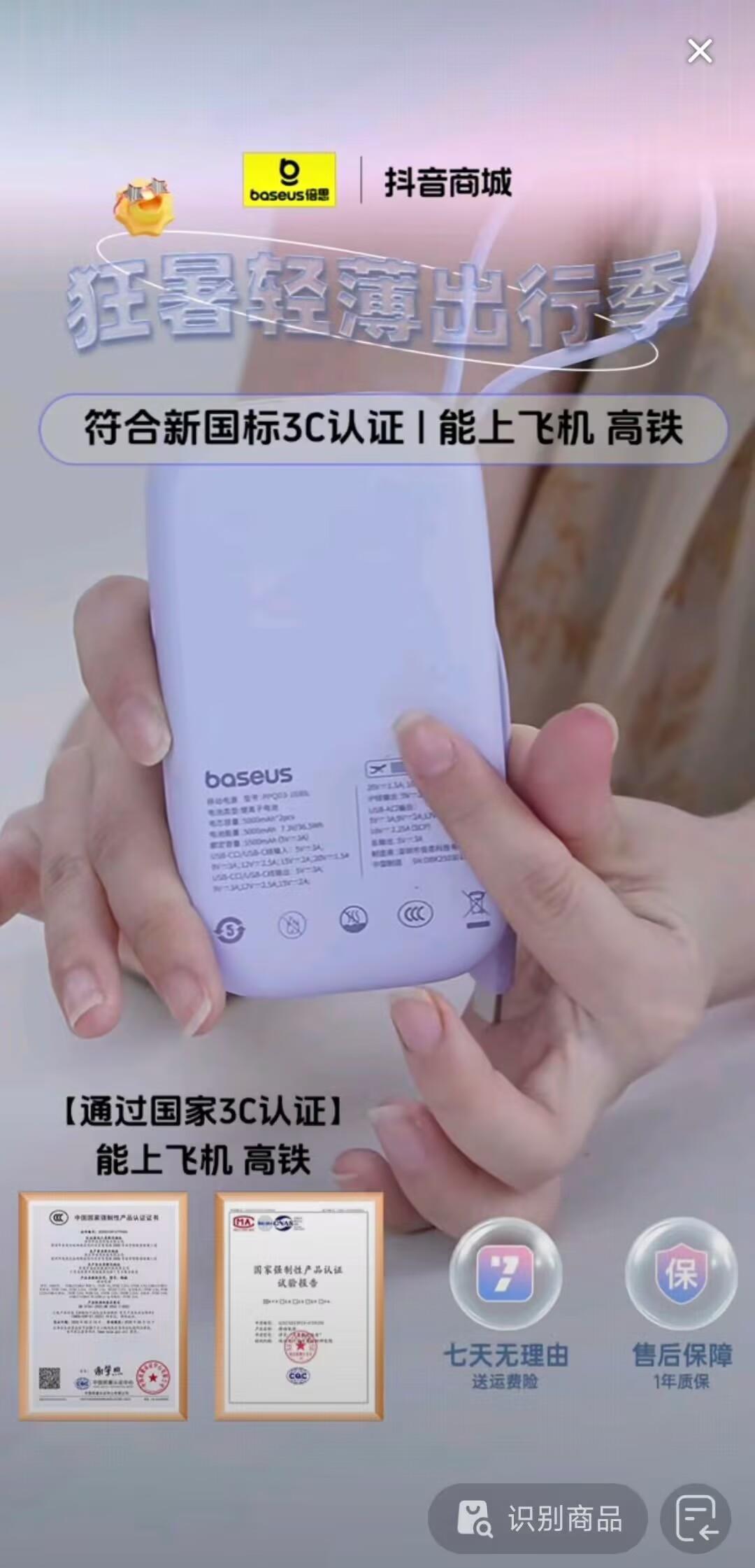 在某充電寶品牌直播間,工作人員專門將自家充電寶的3C認證書打印了出來,并表示目前國家出了新規,沒有3C認證的充電寶一律不能帶上飛機,他們的充電寶都有3C認證,大家可以把3C認證證書截圖下來。