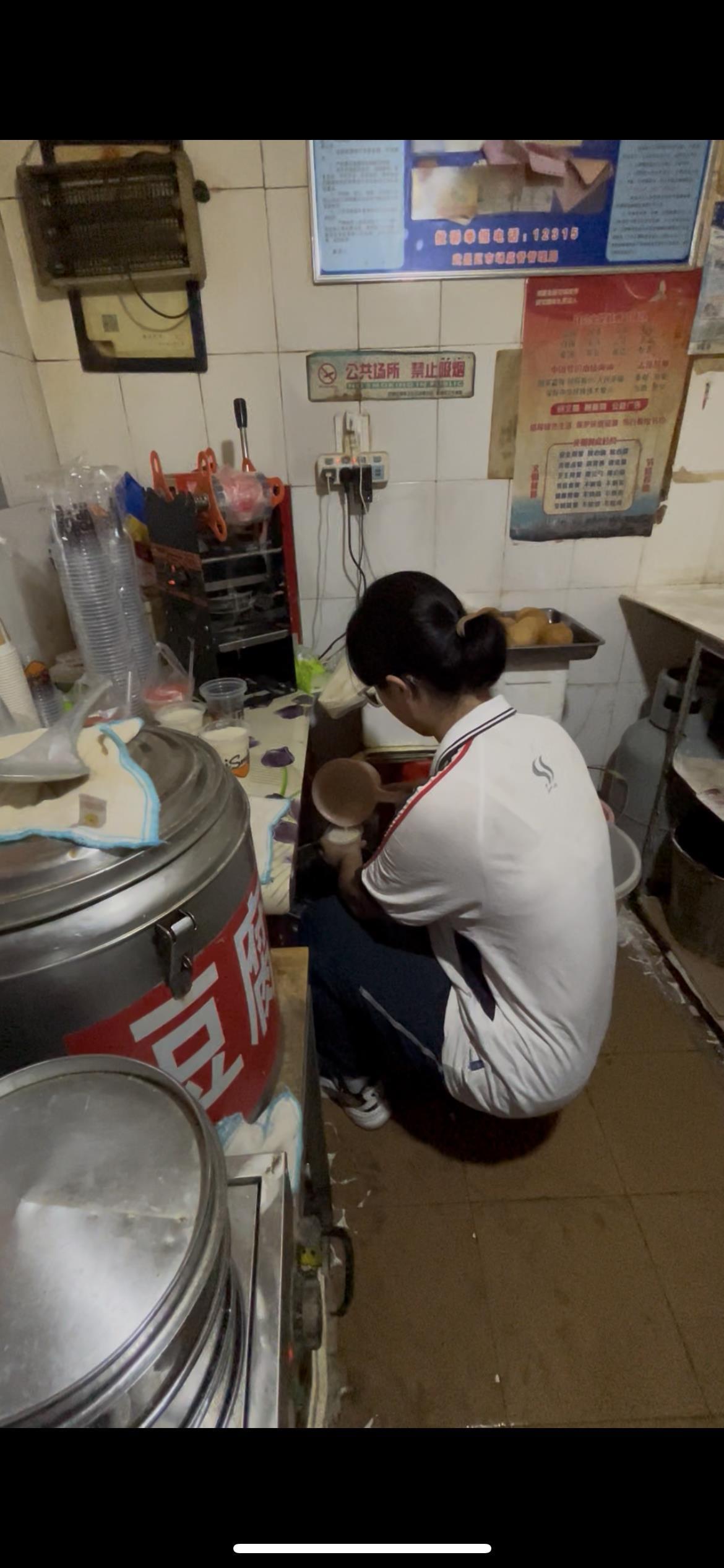 高考一結(jié)束程敏銳就開始給父母幫忙,打好豆?jié){,封裝擺好,豆腐腦裝好遞給客人?!凹依镞€有個弟弟,年齡很小,我就過來給爸媽幫忙!”