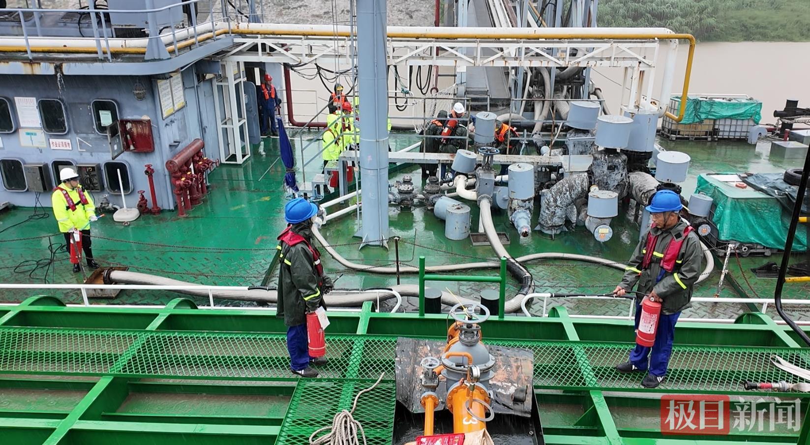 求援電話剛掛斷,救援力量便迅速響應。不到10分鐘,尖銳的警笛聲穿透雨幕,附近的海事巡邏艇風馳電掣般抵達現(xiàn)場。海事工作人員迅速行動,對碼頭周邊水域實施戒嚴,通過高音喇叭喊話,嚴禁其他船只靠近,并嚴密監(jiān)控上下游碼頭,杜絕一切動火作業(yè),從源頭上消除潛在危險。12分鐘后,交通局執(zhí)法中隊也火速趕到油庫碼頭,執(zhí)法人員冒雨在附近堤岸沿線拉起警戒線,耐心疏散岸上過往車輛和行人,全力筑牢安全防線。