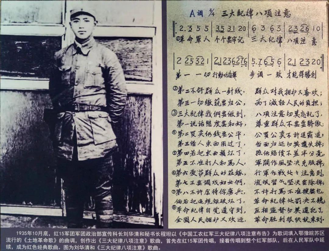 1935年10月,紅二十五軍長征到達陜北后,與陜甘紅軍勝利會師,合編為中國工農(nóng)紅軍第十五軍團。陜甘蘇區(qū)掀起了參軍熱潮,部隊補充了大批新兵。為了加強對新兵的政治紀(jì)律教育,紅十五軍團政治部秘書長程坦與來自大悟年僅18歲的宣傳科長劉華清商量,將《三大紀(jì)律八項注意》改編成朗朗上口的九字節(jié)歌詞。
