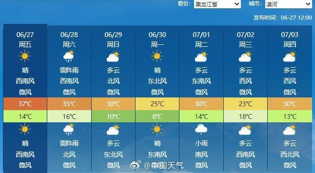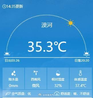 記者關注到,6月27日下午,中國天氣官微發文稱,今年年初氣溫一度低至零下43.6攝氏度的漠河已連續兩天出現35攝氏度以上的高溫,根據天氣預報,28日漠河可能將遭遇高溫三連擊。而有記錄以來,漠河的唯一一次出現三連高溫是在1970年的6月26日至28日,這意味著漠河今年的高溫天氣或與55年前完全重合。