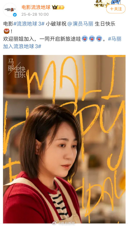 馬麗今天43歲生日,《流浪地球3》宣布她加盟,與吳京、沈騰、劉德華合作,“沈馬”組合又要“上天”了。