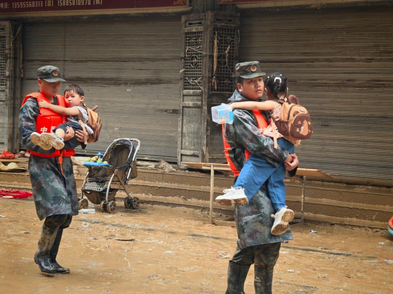 救援人員幫助兒童摛離洪區(qū)(圖源:榕江發(fā)布)