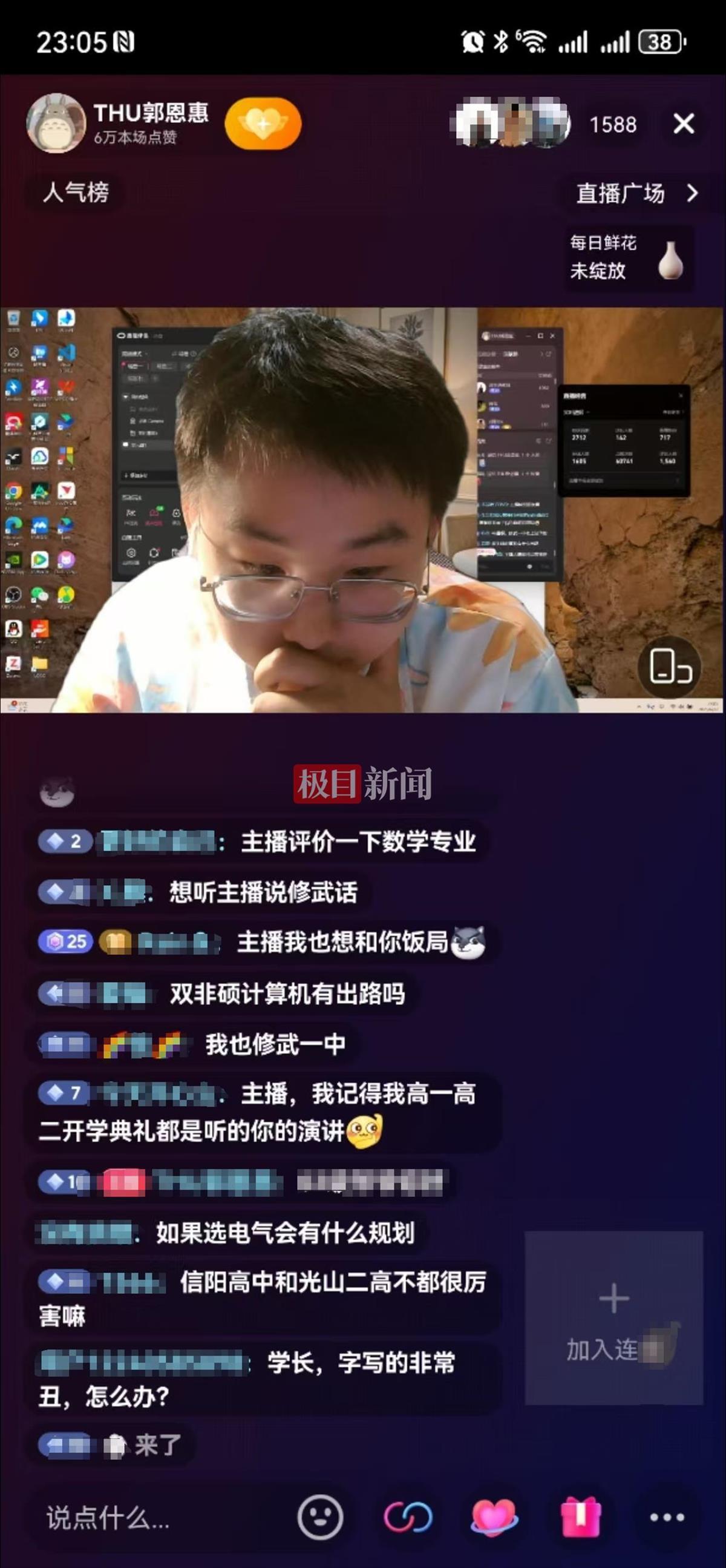 6月27日晚,在北大上了一節課退學后又考上清華的郭恩惠(極目新聞此前報道)開啟了首場直播。他在直播中跟網友交流志愿填報、學校專業選擇等方面的問題。對于有網友推測他即將帶貨的說法,29日,郭恩惠回應極目新聞記者稱,他只是暑假業余時間播著玩,沒想過帶貨。