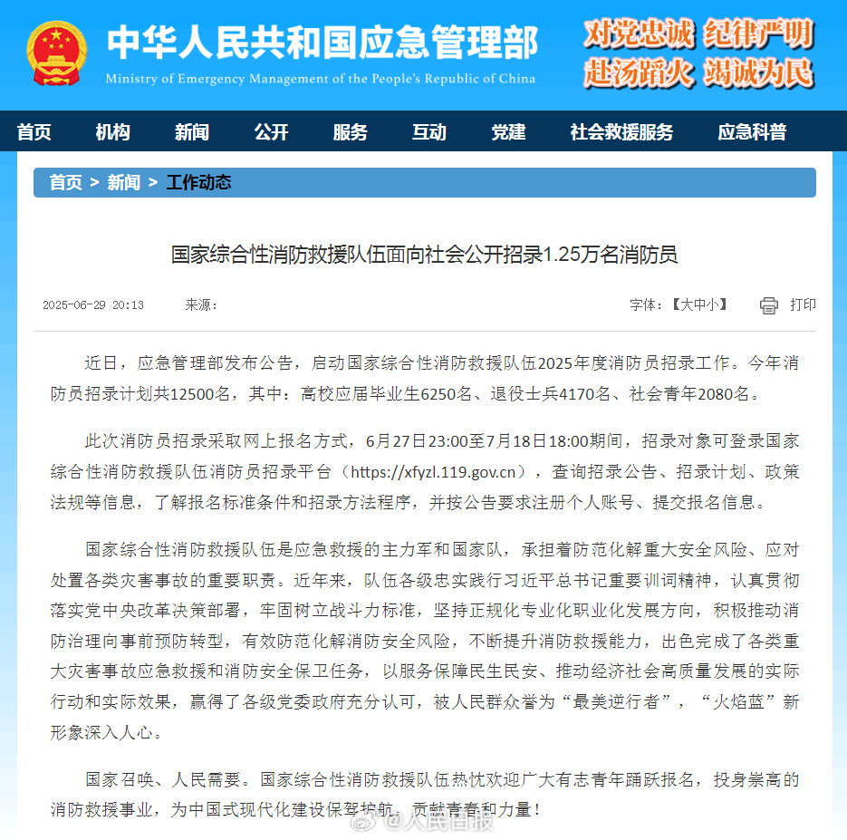 近日,應急管理部發布公告,啟動國家綜合性消防救援隊伍2025年度消防員招錄工作。今年消防員招錄計劃共12500名,其中:高校應屆畢業生6250名、退役士兵4170名、社會青年2080名。