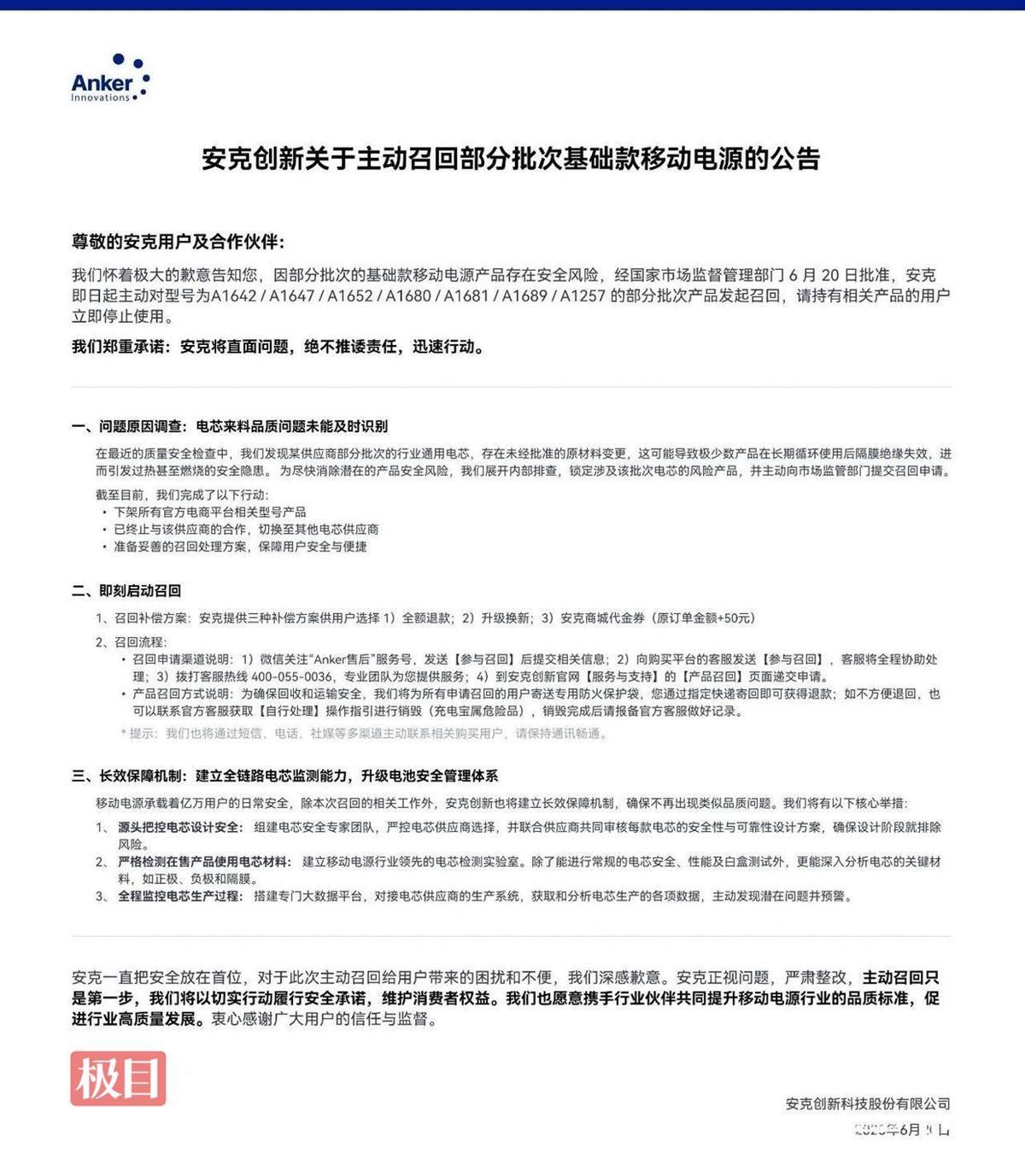 6月20日,安克創(chuàng)新發(fā)布公告,因部分批次基礎(chǔ)款移動電源存在安全風(fēng)險,經(jīng)國家市場監(jiān)督管理部門批準(zhǔn),即日起主動召回型號為A1642/A1647/A1652/A1680/A1681/A1689/A1257的部分批次產(chǎn)品。公告稱,在最近的質(zhì)量安全檢查中,安克發(fā)現(xiàn)某供應(yīng)商部分批次的行業(yè)通用電芯,存在未經(jīng)批準(zhǔn)的原材料變更,這可能導(dǎo)致極少數(shù)產(chǎn)品在長期循環(huán)使用后隔膜絕緣失效,進(jìn)而引發(fā)過熱甚至燃燒的安全隱患。安克創(chuàng)新在公告中表示,補(bǔ)償方式上提供全額退款、升級換新、安克商城代金券(原訂單金額+50元)等三種形式供用戶選擇。
