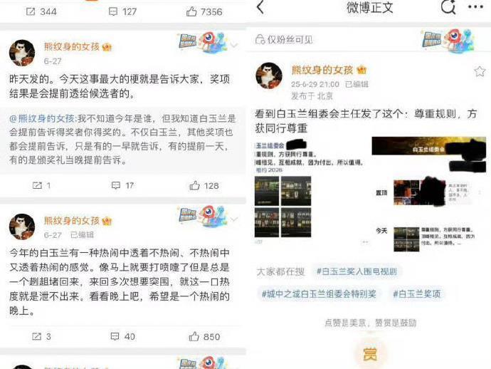 6月30日,微博用戶“熊紋身的女孩”發布截圖稱,“白玉蘭組委會主任”朋友圈發文:“尊重規則,方獲同行尊重”,被解讀為暗指劉亦菲破壞規則,再次引發熱議。