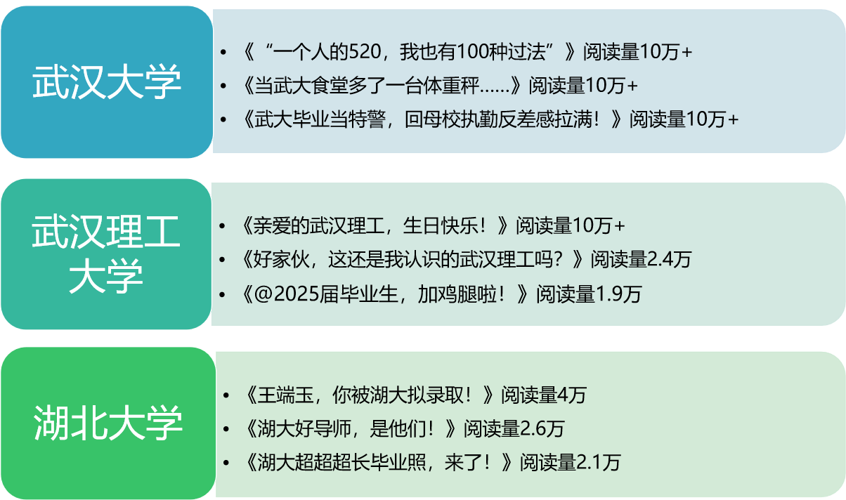 5月,武漢大學、武漢理工大學、湖北大學等賬號的原創文章內容豐富,“氛圍感”“鮮活感”點燃推文熱度。一方面,高校動態拉滿氛圍感。畢業季,“湖北大學”“武漢理工大學”分別發布《湖大超超超長畢業照,來了》《畢業季專屬浪漫!武漢理工畢業小熊等你抱走》,巧用學生合影、文創產品等形式,詮釋青春是場跌跌撞撞的旅行,而畢業是新故事的開始。另一方面,校園生活推文充滿鮮活感。“武漢大學”發布《當武大食堂多了一臺體重秤……》《gogogo,和武大一起出發嘍》等文章,呼吁學生群體科學管理體重、跑步鍛煉身體。此外,《甜咸之爭,該有個結果了!》一文,則以端午粽子的口味選擇為切入點,破除選擇焦慮送上端午祝福,給廣大網友帶來慰藉和治愈。