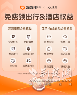 荊楚網(湖北日報網)訊(通訊員肖鞠仁)近日,滴滴出行宣布與亞朵集團達成深度合作,雙方開放、互通會員體系,共建服務體驗生態。在本次合作中,滴滴里程會員與亞朵的會員權益實現等級互通、權益互享、場景互聯,超10項跨界權益齊在線,聯手為用戶打造更豐富、更多元、覆蓋更多出行場景的增值服務。