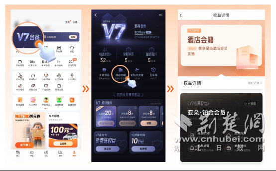 以滴滴V7里程會員為例,用戶進入滴滴里程會員中心頁面,在酒店會籍中可兌換亞朵鉑金體驗會員權益,領取多張亞朵房價折扣券,住宿享8.5折優惠;入住后享免費元氣早餐,品嘗到城市的地道風味;如需升級房型,用戶可使用旋風升房券,有機會享免費升級至所預定房間的高一級別的房型。同時,用戶還能享受到升級優惠券、延遲退房、預定保留、亞朵錦囊、積分獎勵等豐富權益。