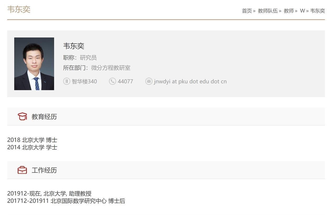 韋東奕個(gè)人信息(圖源:北京大學(xué)數(shù)學(xué)科學(xué)學(xué)院官網(wǎng))
