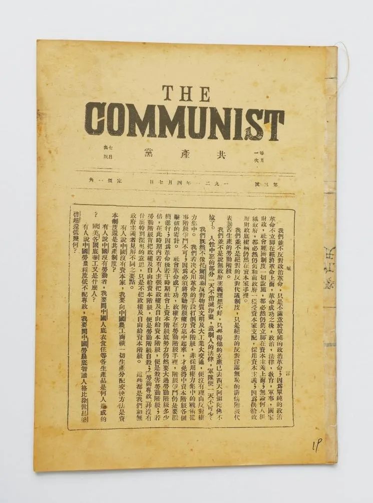 一九二一年四月七日第三號《共產黨》雜志。這年7月,中國共產黨第一次代表大會在上海召開,在嘉興南湖船上閉幕。十三位會議代表中董必武、陳潭秋、包惠僧是黃岡人。