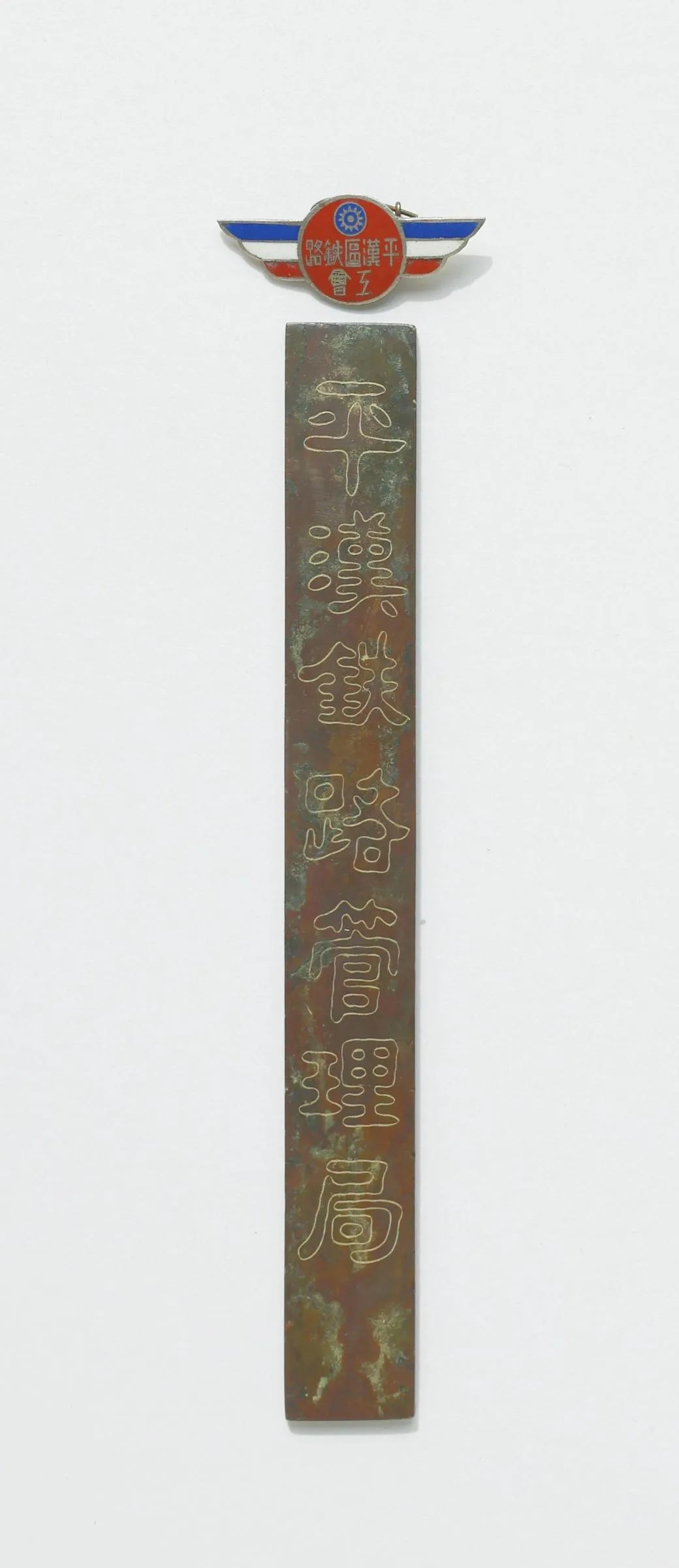 平漢鐵路工會徽章、銘文震尺。1923年初,黃岡籍先賢林育南、林育英等工人運動領袖,策劃并領導了京漢鐵路“二·七”大罷工,組織成立了武漢各行業工會,正是中國共產黨工會組織的初創時期。