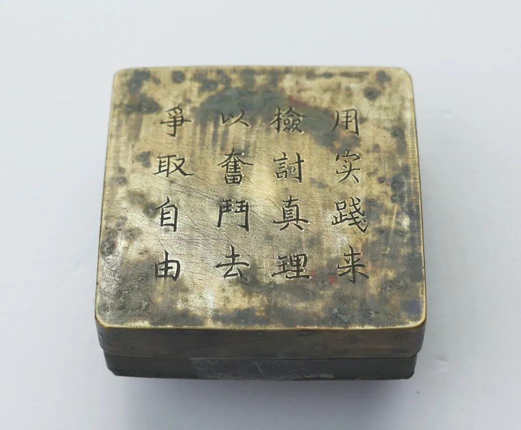 1922年前后,中共湖北某機關使用過的文房墨盒,墨盒純手工刻銅銘文:“用實踐來檢討真理,以奮斗去爭取自由”。銅盒蓋銘文充分說明,早在建黨初期就樹立了“求真務實”的理念,此文物是中國共產黨最早提出真理標準的有力證明。