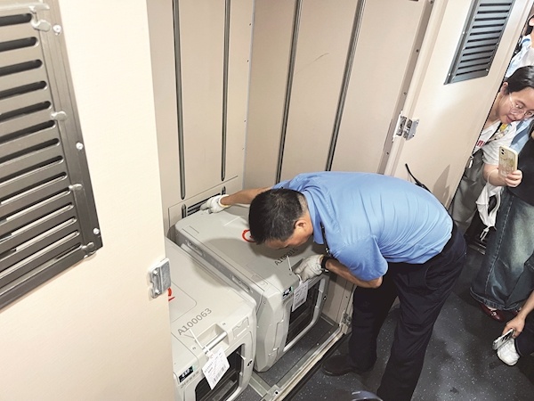 極目新聞記者注意到,托運箱是為寵物特制的,內部有照明、通風和空調系統,箱外有一塊小電子屏,實時顯示箱內含氧量、溫度及濕度數據。一旦數據突破設定臨界值,如含氧量低于19%或溫度超過28℃,顯示屏上的綠燈會轉為紅燈,同時押運員身上攜帶的報警器將會震動及蜂鳴報警。針對寵物的需求,箱體專門設計了外部注水口,可在不開啟箱門的情況下為寵物補水。箱內還配置了專用托盤:如果貓類運輸會加裝貓砂,狗類運輸則會加裝尿墊和防抓網。