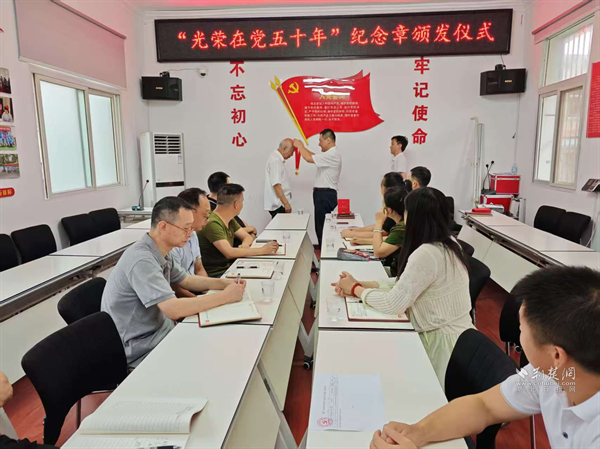 8位老黨員深情朗誦紅色作品,街道副主任盛哲學為“光榮在黨50年”老黨員頒發(fā)紀念章,并講授“嚴守紀律規(guī)矩”專題黨課。