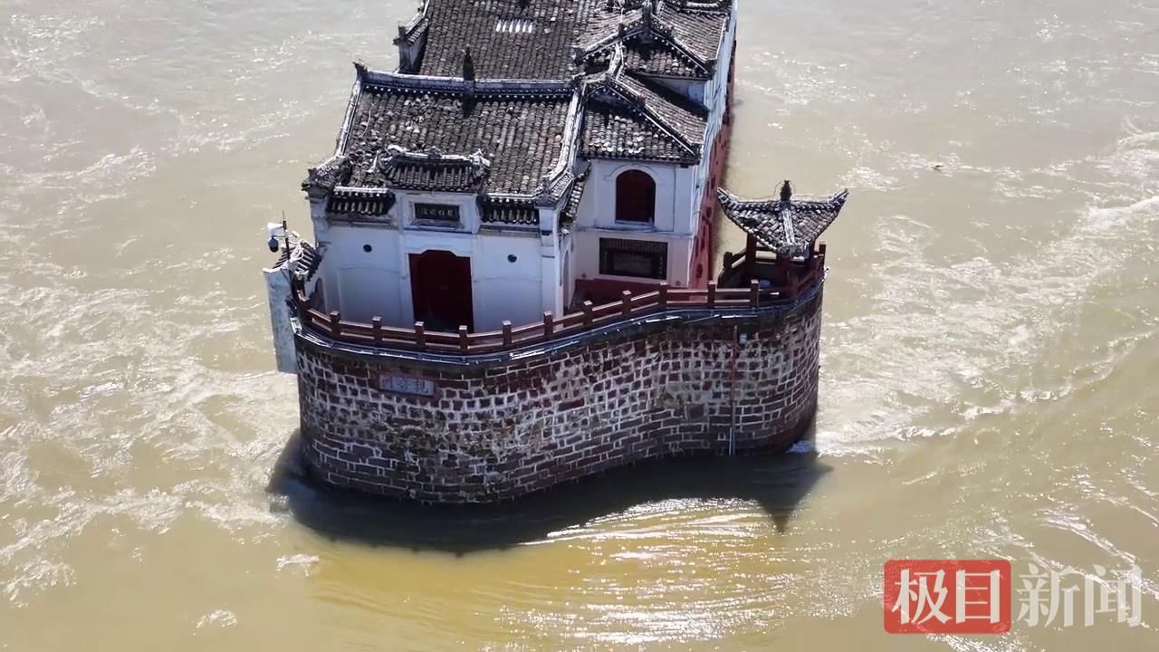 鄂州市博物館余夏紅向極目新聞?dòng)浾呓榻B,建筑依江心礁石而建,形如巨舟劈浪。觀音閣之所以屹立江心700年不倒,首要秘訣是地基牢固。觀音閣建于江心巨礁——龍?bào)创壣稀iw與礁石巧妙融為一體,因此觀音閣又稱龍?bào)创壦隆?/p>
