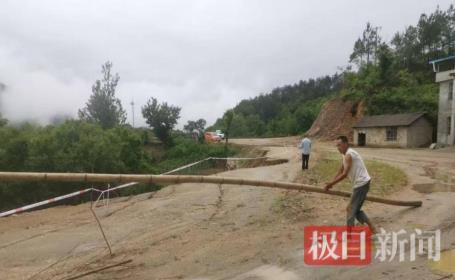王磊立即上報,村兩委第一時間發動附近村民參與險情處置,眾人就地取材,利用樹枝、竹竿、紅塑料、警戒帶等物品設置安全隔離帶。同時,安排2名村民在道路兩旁值守,有序引導過往車輛繞行。由于發現處置及時,保障了3個村及鄰縣蘄春縣共2000余名群眾的出行安全,無人員傷亡。